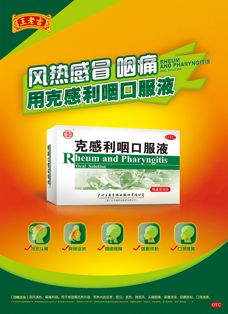 【藥品名稱】通用名稱:克感利咽口服液 漢語拼音:Kegan Liyan Koufuye 【成 份】金銀花、黃芩、荊芥、炒梔子、連翹、玄參、僵蠶(姜制)、地黃、射干、桔梗、薄荷、蟬蛻、防風、甘草。輔料為聚山梨酯80、甜菊素、苯甲酸鈉。 【性 狀】本品為棕褐色的液體;氣微香,味微苦,久置有輕搖易散的沉淀。 【功能主治】疏風清熱,解毒利咽。用于感冒屬風熱外侵,邪熱內擾證者,癥見:發熱,微惡風,頭痛,咽痛,鼻塞流涕,咳嗽痰粘,口渴溲黃。 ...
