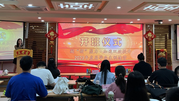 活動的最后,在各位領導及應屆生的見證下,何毅、李冬青、王一維等領導共同敲響了開班大吉的鑼鼓,并宣布本次應屆畢業生訓練營正式開始!