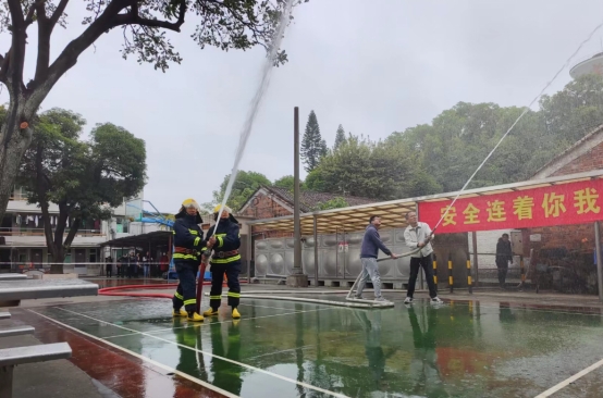 同時,三位宿舍義務消防隊員“武勝鐸、黃金滿、陳鴻”緊急集結,在最近的消火栓接上消防水帶對火場持續射水務求控制火勢蔓延。一分鐘后公司應急救援隊伍也帶上裝備緊急支援,兵分三路分別拉起警戒線保護現場,另一撥穿戴整套救援裝備的隊員等待總指揮指令隨時準備進入火場救援搶險,最后一路人馬拉起廣場端的消防水帶與宿舍義務消防隊形成合力,最終成功把五層樓宿舍的火勢撲滅。