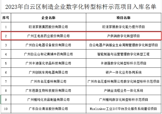 近日,廣州市白云區科技工業商務和信息化局根據《關于印發2023年白云區制造企業數字化轉型標桿示范項目申報指南的通知》要求,經企業申報、專家評審、征求有關部門意見等程序,公示了10個入庫項目,其中,王老吉藥業提報的“產供銷數字化轉型項目”成功入庫。