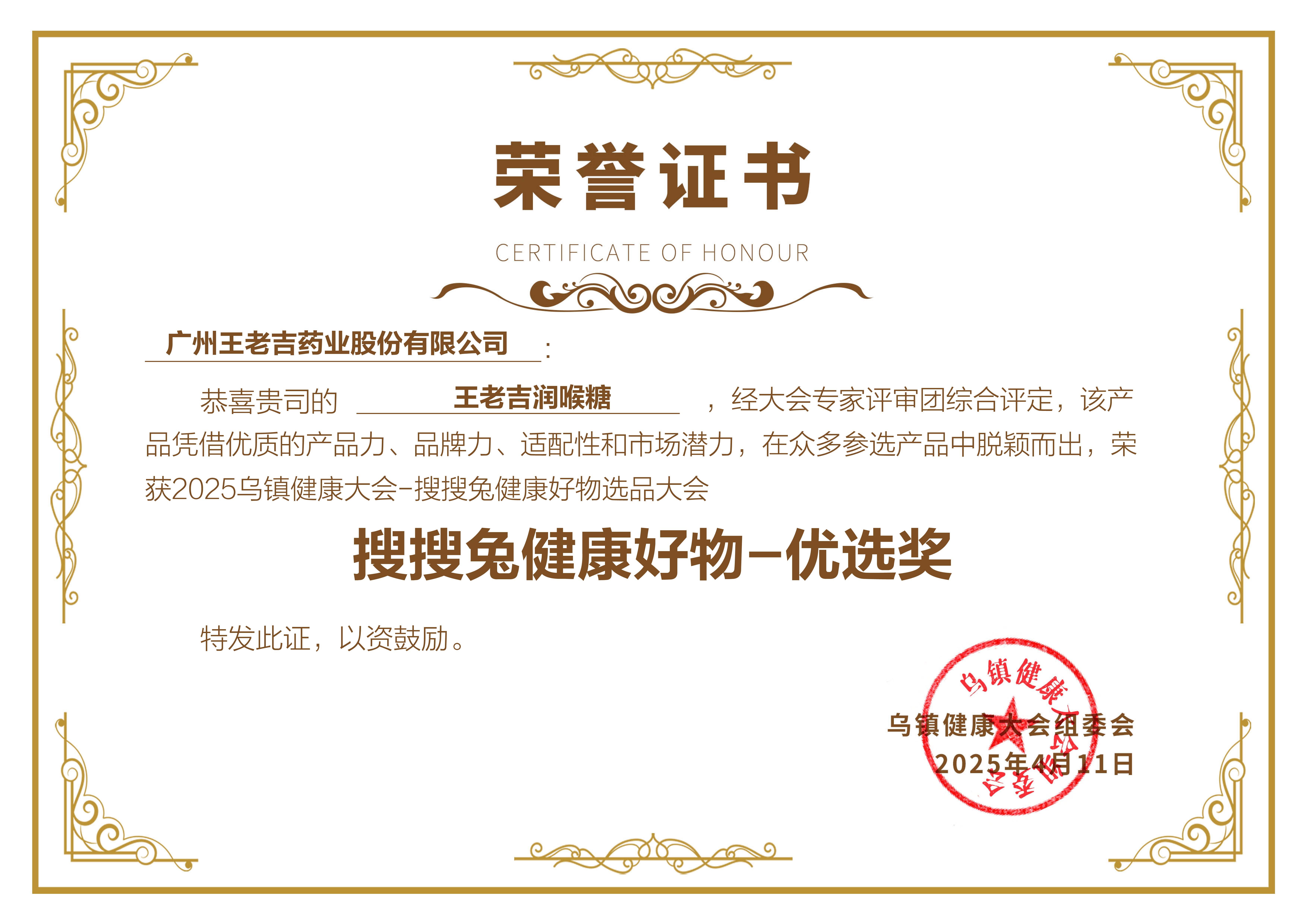 王老吉潤喉糖獲得:“搜搜兔健康好物-優選獎”,王老吉綠盒涼茶更是斬獲最高榮譽:“搜搜兔健康好物-甄選獎”。 -