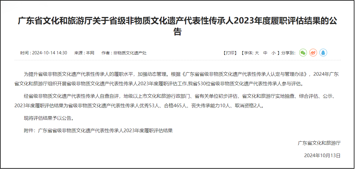 廣東省文化和旅游廳在官方網站上公布了《廣東省文化和旅游廳關于省級非物質文化遺產代表性傳承人2023年度履職評估結果的公告》,其中,涼茶省級非遺代表性傳承人、王老吉大健康研究院院長、公司副總裁鄭榮波獲評優秀。