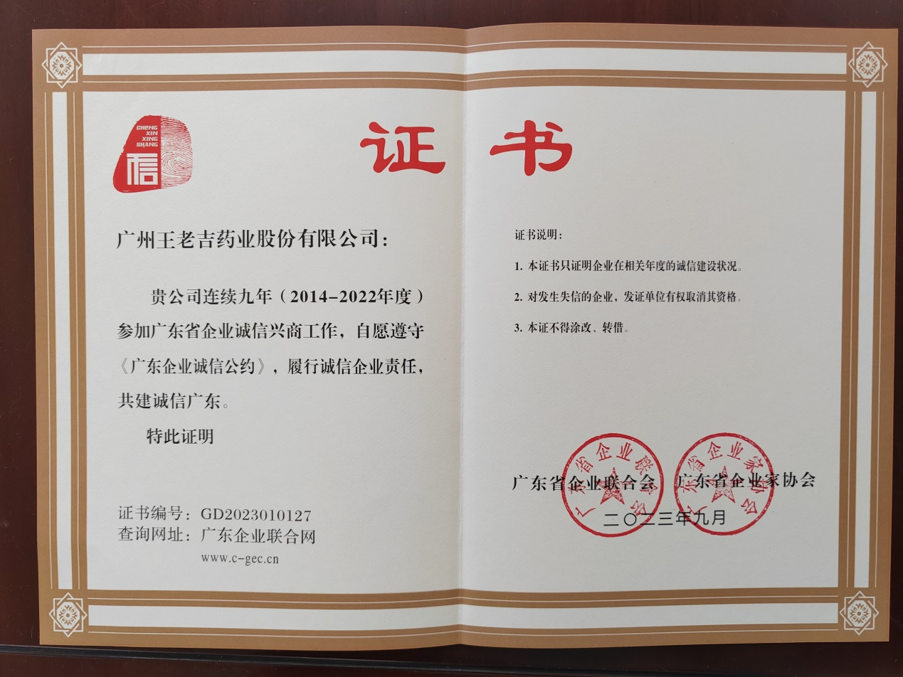 2023年9月,廣州王老吉藥業(yè)股份有限公司連續(xù)九年獲得“廣東省誠信興商企業(yè)”證書。