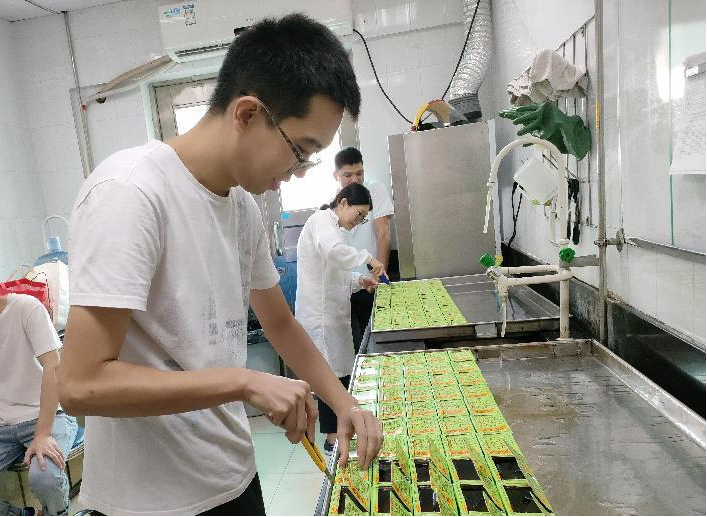 看!打檢開包試驗(yàn)速度比拼也已拉開帷幕了,此過程為涼茶產(chǎn)品批次質(zhì)量和貨架期質(zhì)量驗(yàn)證最重要的檢測程序之一。看:參賽選手們對著一盤55包的樣品,手拿利刀,出手要快,姿勢要帥,在這基礎(chǔ)上還是要安全快速才最為重要。在這打檢開包比賽中,比賽者謹(jǐn)記“一橫二豎三角度,四刀五邊六力度”的口訣,憑借著獨(dú)一無二的訣竅,看誰能脫穎而出,靠的還是技術(shù)活啊!只見一快刀手,55包的樣品在不到1分半的時(shí)間內(nèi),一包包充滿香氣,晶瑩剔透的涼茶已呈現(xiàn)在評委的眼前。此時(shí)此刻,或許評委品的不是涼茶,更多的是驚嘆其精湛的技術(shù)吧。經(jīng)過激烈比賽,由食品質(zhì)量部的廠部同事和OEM品控駐點(diǎn)包攬了前三名,他們分別是第一名林灼勤,第二名葉揚(yáng)威和胡素輝,第三名鄭穎俊、鐘飛虹和成偉杰。